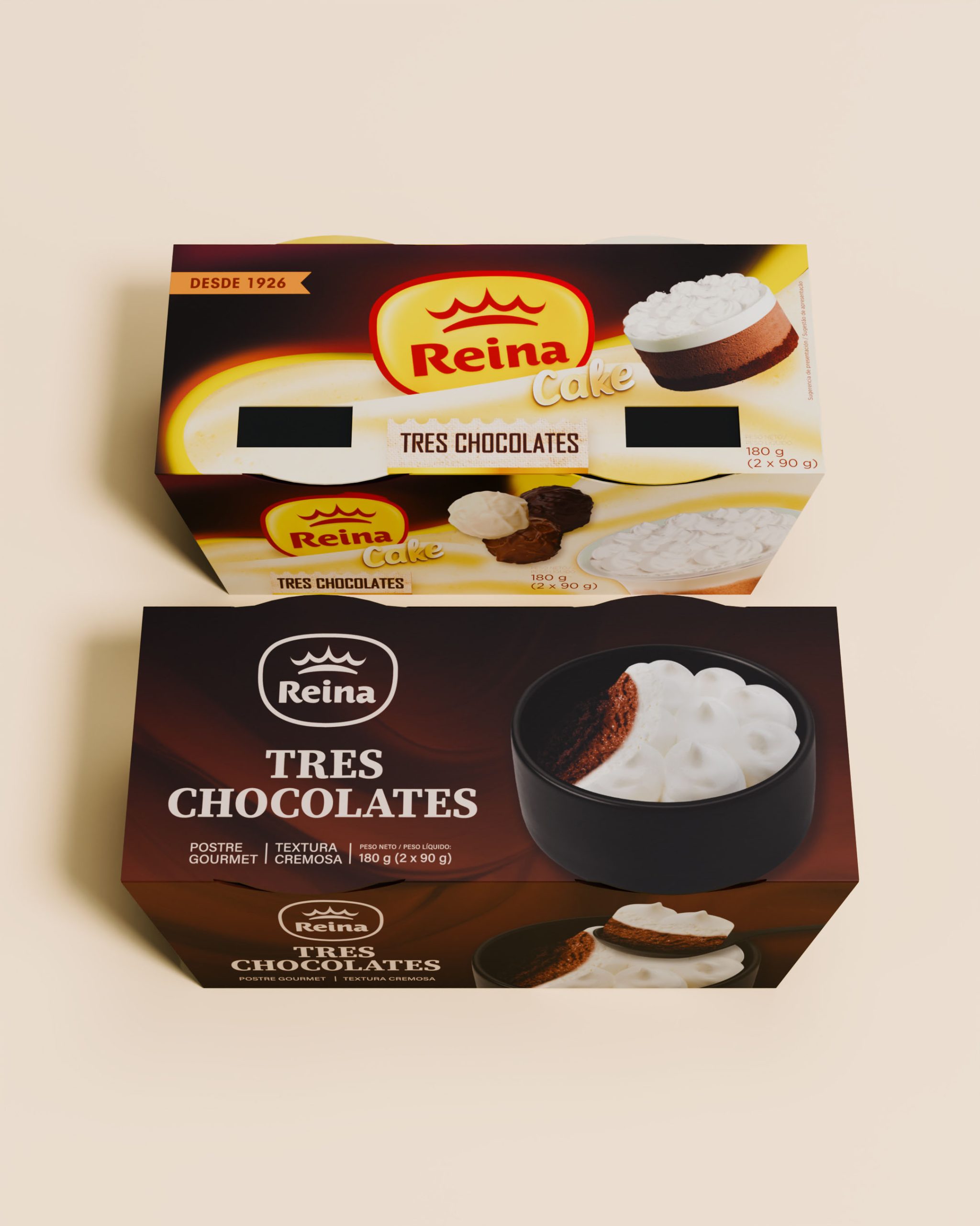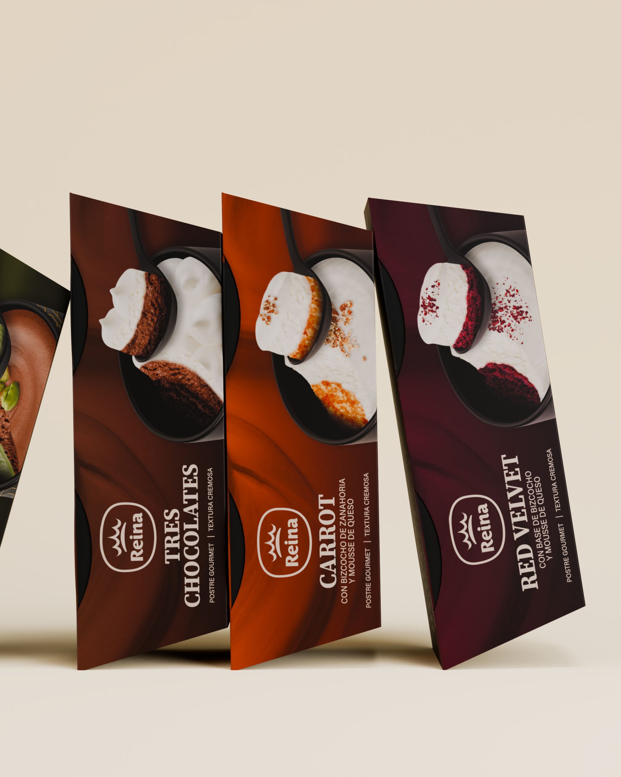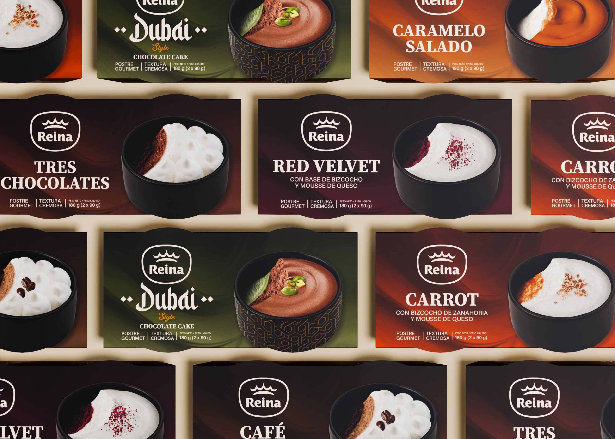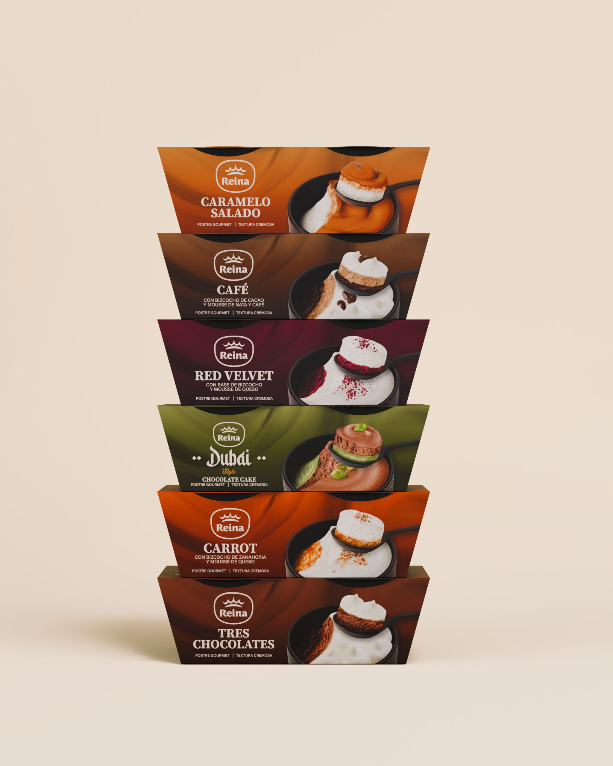 El rediseño integral de la gama de tartas Reina Cake de Postres Reina responde a la necesidad de buscar un posicionamiento más actual y sofisticado. El reto consiste en transmitir textura, artesanía y un sabor excepcional, dirigiéndonos a un mercado de gran consumo pero con estándares de alta calidad.